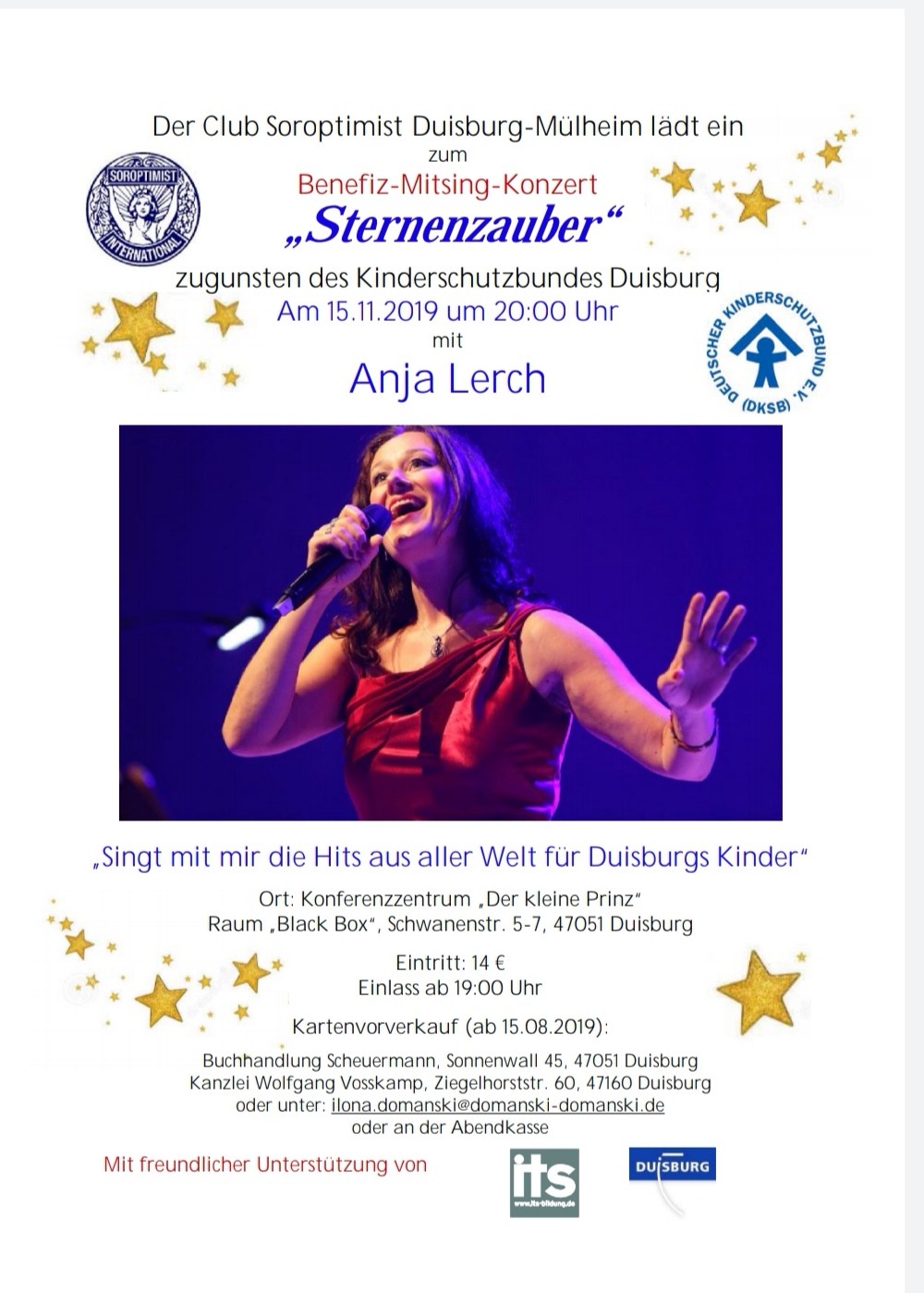 Nach dem großen Erfolg im letzten Jahr findet dieses Jahr erneut ein Mitsing-Konzert mit Anja Lerch im Konferenzzentrum „Der Kleine Prinz“ in Duisburg statt. Die Einnahmen dieses Benefiz-Konzerts, das wieder der Club Soroptimist Duisburg-Mülheim veranstaltet, gehen diesmal zugunsten des Kinderschutzbundes Duisburg. Wir freuen uns, dass durch dieses tolle Konzert, das wie beim letzten Mal den Namen „Sternenzauber“ trägt und alle Besucher in eine vorweihnachtliche Stimmung versetzen wird, ein wichtiger Beitrag zur Finanzierung unserer Arbeit mit Duisburger Kindern geleistet wird. Karten sind im Vorverkauf erhältlich bei der Buchhandlung Scheuermann, Kanzlei Wolfgang Vosskamp oder unter: ilona.domanski@domanski-domanski.de